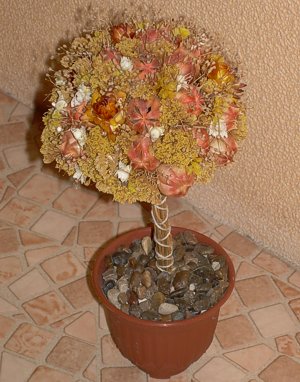 Я сама делаю такие деревья, только за основу беру не только сухоцветы, а различный природный материал ( косточки персика, сливы, головки маа, жолуди, орехи, чечевицу, листья кукурузы). Как наполняющий материал для горшка использую алибастр и как декорирующий - чечевицу, камнями, песком, который сверху заливаю прозразным лаком - эфект просто бомба). Клей использую специальный, наношу пистолетом.