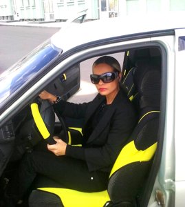 Лариса сидит вполоборота, а вот цвет руля не сочетается с цветом машины.