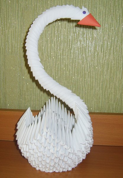 Я тоже делала лебедя из бумаги, на него ушло около 450 модулей, и смотрится он намного красивее. На всю работу ушло чуть меньше суток, если считать без прерывов. Зато результат радует каждый день