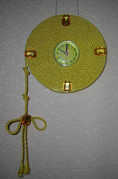 «Не зря говорят, что во время беременности просыпается дух творчества: мной в это время были сделаны часы. Изготовить их легко и просто. Я купила недорогой китайский будильник, тесьму в виде каната, декоративные камни в швейном магазине и супер-клей. От будильника отломала циферблат. Вырезала из плотного картона круг и сделала круглое отверстие внутри него , чтобы вставить циферблат. Потом наклеила тесьму супер-клеем на нашу картонную заготовку, как бы обматывая часы, начиная с середины. Завязала на конце бантик. В завершении приклеила декоративные камни при помощи супер-клея». |