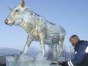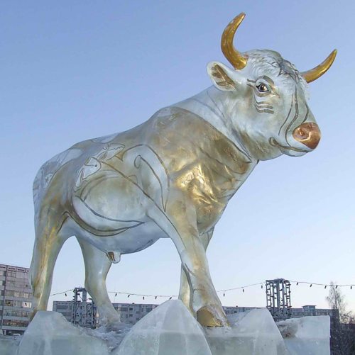 Их преображением занимался художник Анатолий Пашин: «Просили сделать зимние узоры. Но это же неинтересно. Фигуры смотрятся ледяными, но при этом использован не просто орнамент». Вдохновляли художника китайские рельефы и греческие мифы. Зевс превратился в быка, чтобы похитить Европу - этот сюжет отразился на центральной фигуре. Обнаженная красавица на спине быка не должна вызвать протестов со стороны поборников морали. Физиологии в картине никакой, все прилично-условно. Но, несмотря на утонченные реминисценции, народ принял коров по-свойски. «Одна бабушка кинулась со слезами: Зоренька! - рассказывает Пашин. - Другие спрашивают, почему быки - кастраты». За десять минут, что мы стоим возле «стада», к художнику подходят целыми делегациями. Гадают, из чего сделаны бычки. Жалеют коровку, которая одна, бедняжка, среди быков. Фотографируются на фоне символа наступающего года. «Красота-то какая», - с чувством произносит стоящая рядом бабушка. А вот Пашин не вполне доволен: «Не получилось до конца задумку воплотить. Я хотел, чтобы ледяные постаменты изнутри светились. Но дорого, говорят».