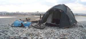 На фото: Евгений Шкурко поехал к морю на велосипеде. Палатка на ночь становилась и домом, и гаражом.