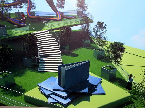 По сути это большой вертикальный парк для молодежи. Многоуровневый, под куполом с солнечной батареей, он вмещает в себя несколько зон: танцпол, игровой клуб, площадки для влюбленных, для отдыхающих или готовящихся к лекциям. Знаковые элементы «П@ляны» - фигурки студентов-закорючек, разбросанных по всей территории. Они спят на последней парте, висят в сети, опаздывают на лекции… |