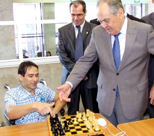 Высоких гостей у порога ГЦДТ встречали дети в синей форме с камазовской символикой. До начала совещания Минтимер Шарипович сыграл в шахматы с челнинцем Стасом Михеевым - чемпионом мира среди инвалидов-«опорников». Срубили друг у друга по два слона и по коню. Остановились на ничьей. Еще президент осмотрел выставку художника-инвалида Рената Мусина. У парня ДЦП, поэтому во время работы кисть он держит не рукой, а зубами. Президент похвалил его работы и, тихонько положив на стол деньги, сказал, что одну из картин (портрет девушки в национальной одежде) покупает. Позже мы выяснили, что президент дал 5 тысяч. Как только Шаймиев отошел от художника, покупать его работы бросились министры. За две минуты не осталось ни одной картины.