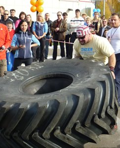 Заявились 8 человек – по четыре в категориях профессионалов и любителей. Этапы для тех и других были почти одинаковыми, с той лишь разницей, что для профессионалов дистанции, на которых переносились тяжести, увеличивались вдвое, и кое-где утяжелялись импровизированные снаряды. Сначала в дисциплине «фермерская прогулка» нужно было на время пробежать с 35-киллограммовыми канистрами в каждой руке. Затем на этапе «перекати поле» - перевернуть пять раз огромную тракторную покрышку: для любителей весом 120 килограммов, для профи – 180. Профессионалы тянули за канат набитую людьми «Газель» общей массой около 4,5 тонны, а любители - автомобиль «БМВ». А венчала шоу «мешочная пирамида»: перетаскивание и складывание мешков весом 40, 50, 60, 70 и 80 кг. Почти все участники, кроме того, что регулярно занимаются на тренажерах, в анкетах указали увлечение пауэрлифтингом или армрестлингом, в которых имеют спортивные разряды. Борьба с килограммами для них - привычное дело. А вот борьба со временем – все нужно было постараться сделать быстрее соперника – серьезно усложняла испытание.