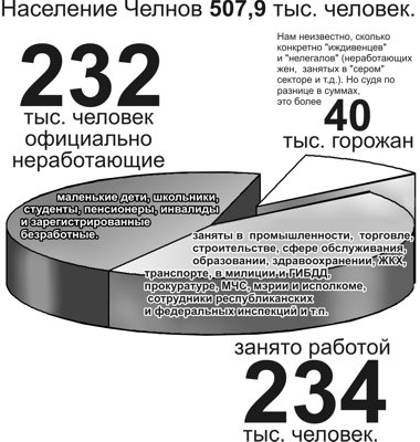 Цифры не "бьются" примерно на 41 тыс. - статистика не знает, сколько у нас конкретно "иждивенцев" и "нелегалов" (неработающих жен, занятых в "сером" секторе и т.д.). Но судя по разнице в суммах, это многие тысячи челнинцев.