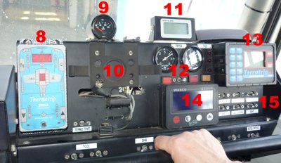 1 - манометры подкачки передних и задних колес. Эти два штатных прибора установлены выше, чтобы постоянно были в поле зрения ведителя. Но пилот во время спецучастка не занимается подкачкой, они параллельно выведены механику. То есть, водитель только говорит, какое давление нужно.
