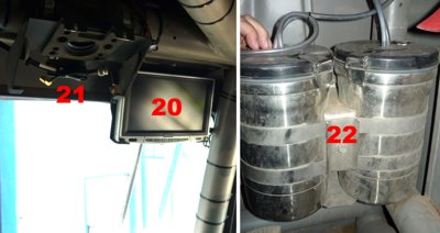 20 - монитор, на котором проецируется картинка с трех видеокамер, направленных на мотоотсек, на середину и зад платформы. А у водителя монитор, который проецирует картинку камеры, заменяющей зеркало заднего вида.