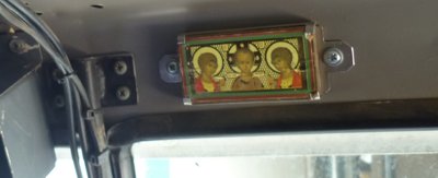Иконка - ее нам подарил батюшка, которого, как и нас, остановили на одном из постов ГАИ за превышение скорости. У нее уже есть штатное место, специальный крепеж. Мы меняем кабины и машины, но она всегда с нами.