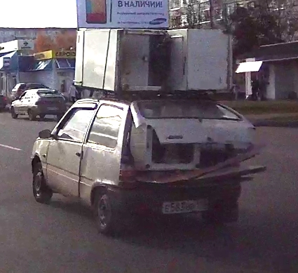 Вот такое чудо транспортировки зафиксировал видеорегистратор "Челны ЛТД" - два холодильника на крышу, а остальной металлолом в багажник. И сколько бы не посмеивались над "окушкой", а свои функции доставки из пункта А в пункт Б автомобиль из Набережных Челнов до сих пор исполняет исправно.
