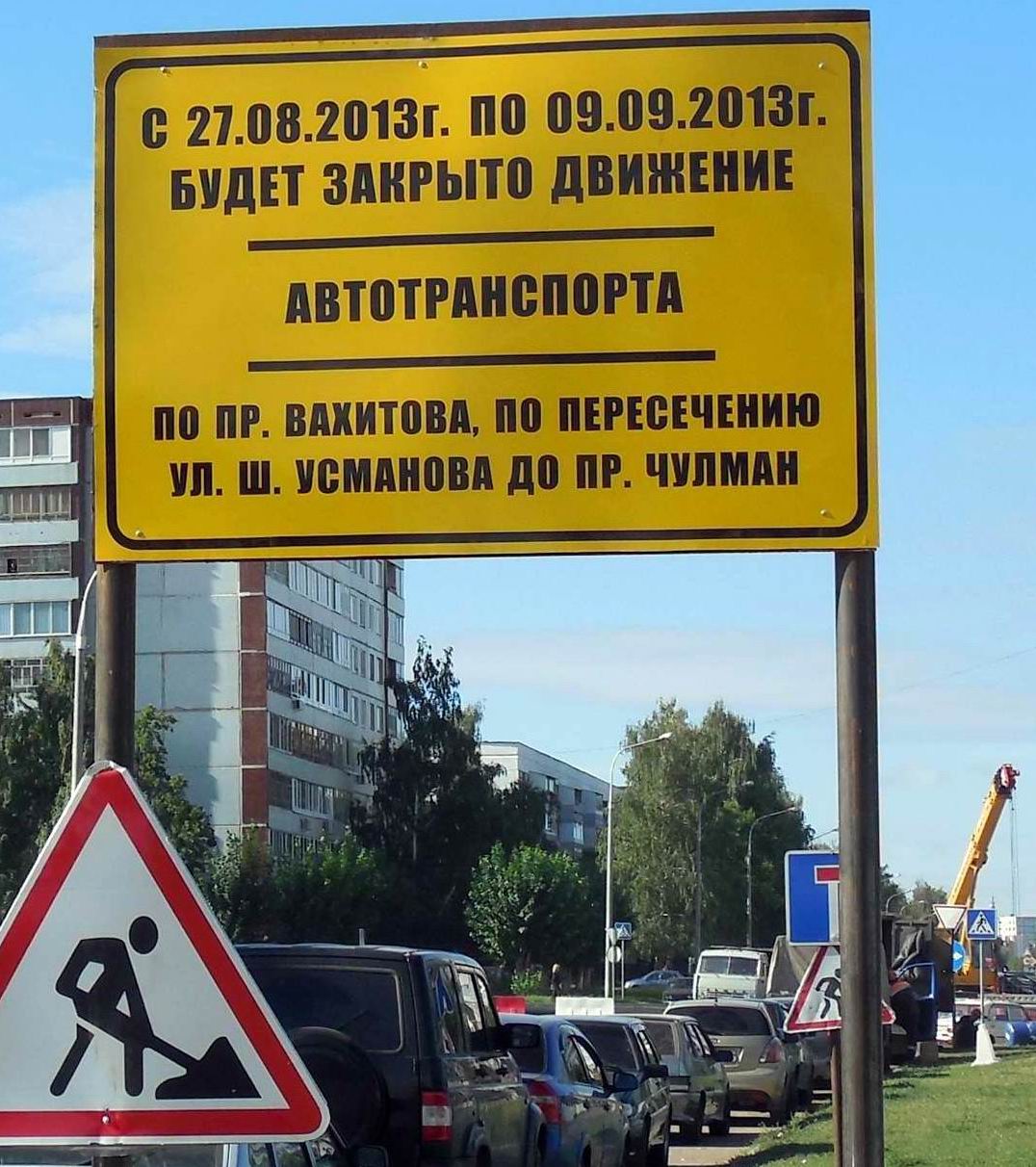 Как мы уже писали, в Набережных Челнах в связи с ремонтом теплотрассы предприятием теплосетей наполовину перекрыли проспект Вахитова у пересечения с улицей Шамиля Усманова. Водители, представшие перед фактом, возмущались, что на подъезде к этому участку не было предупреждающих знаков и щитов с информацией. Сегодня на полосе движения (от проспекта Чулман до улицы Усманова) ремонтные работы заканчиваются, ее скоро откроют. Ремонтники готовятся перекрыть вторую полосу (от улицы Усманова до проспекта Чулман). Очевидно, критика ими была учтена, на улице Усманова появился щит, на котором сообщается: "С 27.08.2013 г. по 09.09.2013 г. будет закрыто движение автотранспорта по пр. Вахитова по пересечению ул. Ш. Усманова до пр. Чулман". А на подъезде к этому участку установлены соответствующие дорожные знаки "Тупик" и "Дорожные работы". Заблаговременно выбирайте пути объезда.