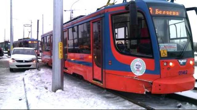 Трамваи, пущенные по новым путям несколько дней назад, уже становятся фигурантами сводок ДТП. Сегодня около 14.00 на трамвайном переезде напротив торгового центра «Омега» женщина, управлявшая автомобилем марки "рено", не уступила дорогу трамваю, движущемуся в сторону проспекта Сююмбике. В результате столкновения движение электротранспорта было затруднено. За трамваем - участником ДТП образовалась очередь из вагонов.