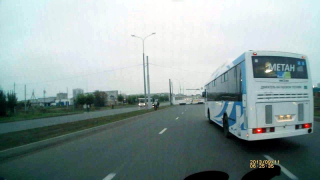 11 сентября в 6.25 один из маршрутных микроавтобусов ехал от заводов по проспекту Вахитова. За кольцом он обогнал большой белый автобус "НефАЗ"с символикой Универсиады-2013 на борту, с надписью "Метан" на заднем стекле и с цифрами на номерном знаке 316 (все три буквы предположительно "Р"). Когда все машины остановились на запрещающий сигнал светофора перед автобусной остановкой "Магазин "КАМАЗ", "НефАЗ", не сбавляя скорости, промчался на красный свет. То ли он решил отыграть время у своих более шустрых конкурентов, то ли так спешил за пассажирами? Надеемся, разберется ГИБДД, куда мы передали присланный нам видеоматериал (смотри видео).