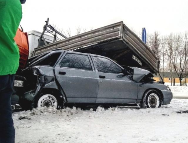 Сегодня утром на проспекте Машиностроителей напротив гипермаркета "Леруа Марлен" столкнулись три автомобиля - "КАМАЗ", "ВАЗ-2110" и грузовая "Газель". ДТП произошло на въезде в разворот. Водитель "КАМАЗа" не смог вовремя затормозить и врезался в легковушку, которая в свою очередь залетела под "Газель". К счастью, в автоаварии никто серьезно не пострадал.