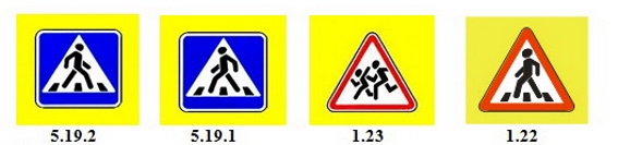 Отныне дорожные знаки: «Пешеходный переход» (5.19.1 и 5.19.2), «Дети» (1.23) И «Пешеходный переход» (1.22) будут устанавливаться только на щитах со световозвращающей пленкой желто-зеленого цвета: