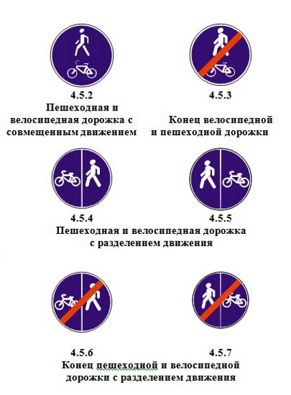 Вводятся и новые знаки: «Пешеходная и велосипедная дорожка с совмещенным движением» (4.5.2), «Пешеходная и велосипедная дорожка с разделением движения» (4.5.4 и 4.5.5), а также знаки, обозначающие конец действия указанных знаков - 4.5.3, 4.5.6 и 4.5.7: