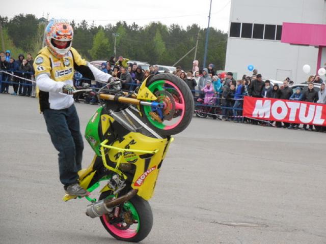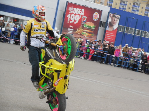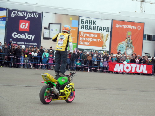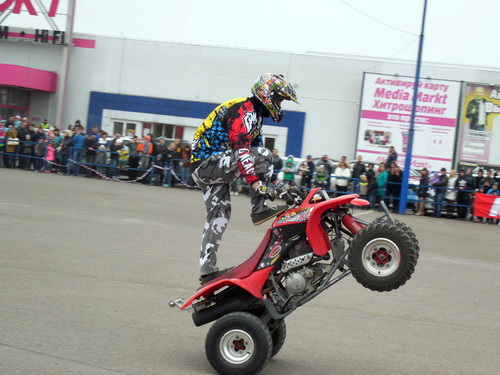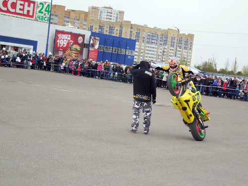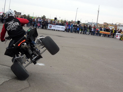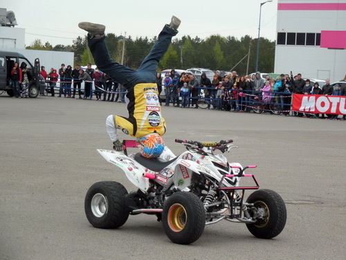 Тем временем на освободившейся площадке собирались зрители, чтобы посмотреть мотошоу. Команда из казанской мотошколы Big Kazan Extreme продемонстрировала стантрайдинг – трюковую езду на мотоцикле и квадроциклах. Три стантрайдера – Григорий Марков, Александр Бардин и Дамир Халилов ставили своих двух- и четырехколесных «коней» на дыбы и выполняли на них акробатические трюки.