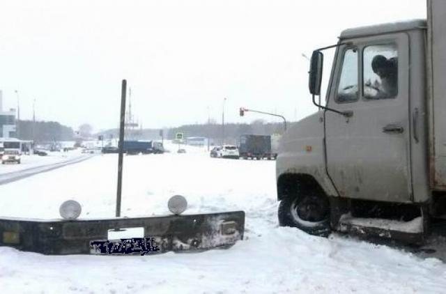 Фото с описанием мелкой аварии пришло от читателя Газеты «Челны ЛТД». ДТП не масштабное, но как нельзя лучше описывает ситуацию сложившуюся на дорогах Набережных Челнов. Сегодня около 14.00 на проспекте Х. Туфана грузовой автомобиль не вписался в разворот, врезавшись в бордюр под слоем снега. В результате машина лишилась бампера и серьезно повредила колесо.