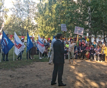 Во время народного схода во дворе дома 29/15 в демократию общественного самоуправления (которую мэр Набережных Челнов сейчас внедряет) вторглась демократия, которую олицетворяет арестованный депутат Еретнов. Во время приветственного выступления мэра перед собравшимися на поляну перед полукругом сидящими жителями района вышла невысокая женщина в коротких брюках и с двумя плакатами в руках, которые она держала над головой. "Позор двойникам Еретнова" было написано на одном плакате, а на другом: "Не виновен. Свободу Еретнову!" Она ходила с плакатами вдоль собравшихся мимо выступающего мэра, который на нее никак не отреагировал. На нее сначала зашикали собравшиеся, а потом офицеры полиции.