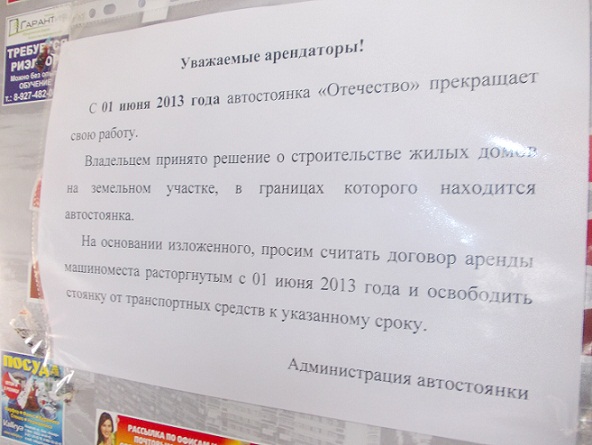 «С 1 июня прекращаем работу в связи со строительством жилых домов», - подобное объявление в субботу появилось на автостоянке «Отечество», которое находится на пустыре между 17 и 45 микрорайонами. Такая же участь постигнет 1 июня и соседнюю стоянку «ВОА-1» (Всероссийское общество автомобилистов). Но там пока объявление не развесили. Знают об этом лишь те автовладельцы, которые пытались заплатить за место в счет следующего месяца. Деньги у них не берут.