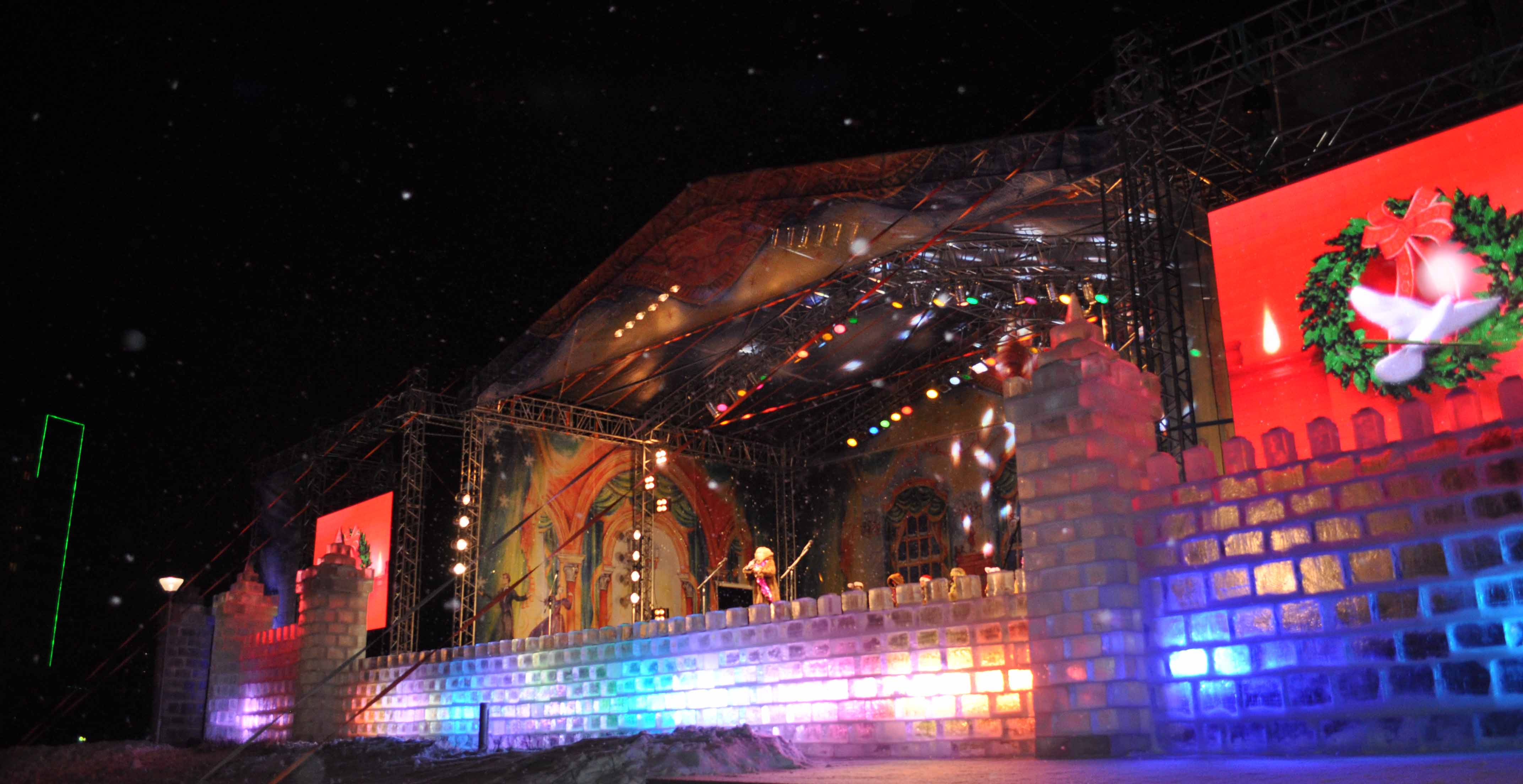 В семь-восемь вечера все подъездные пути уже были заняты машинами. Для того, чтобы припарковаться, автомобилисты вставали в очередь. Позже, выезжая, они создадут протяженную пробку от остановки "16-й комплекс" до "Центра". Ведь именно к проспекту Сююмбике ближе всего стояла праздничная сцена, декорированная под старинный бальный зал. Ее расположили "спиной" к мэрии, "лицом" и звуком к площади. С фронтальной части подсвеченную конструкцию окружала ледяная крепостная стена с башнями. В некоторые моменты на сцене выступали более тридцати человек.