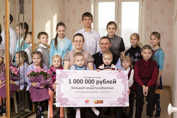 15 января 2014 года в семье Калабухиных зазвонил телефон: «Вам миллион»... «Мы надеялись, что на нас обратят внимание, но звонок все равно был неожиданным, - рассказывает Сергей. - До конца так и не верилось, даже когда мы отправили письма с ксерокопиями документов, подтверждающих количество детей и платежи по ипотеке. А 24 января деньги были уже на счету в банке! До сих пор не можем отойти от радости: вроде бы только-только думали, как выжить, а тут вдруг все проблемы одним разом разрешились..."