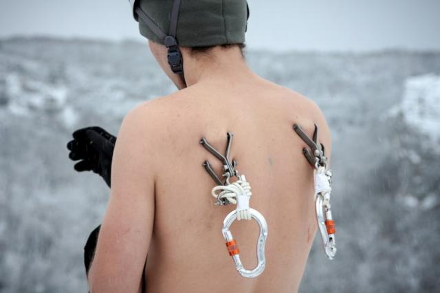 «Считается, что зимой кожа более тонкая. И конечно, риск порыва был. Что касается боли в местах проколов, то она выносимая. Еще меньше её чувствуешь из-за адреналина. После прыжка, когда я повис на веревке, то не смог шевелить руками - поскольку кожа сильно натянулась». Как рассказал альпинист, бывали случаи, когда кожа прыгунов не выдерживала и рвалась. Поэтому в таких прыжках обязателен страховочный пояс.