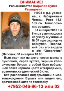 Сегодня пришло еще одно печальное известие: 19-летнего учащегося училища №57 г. Набережные Челны Булата Шарипова, который пропал 31 января, нашли мертвым. Напомним, в последний январский день он ушел на учебу и не вернулся. Последний раз его видели в этот же день в садовом обществе "Энергетик" в районе Лесоцеха. О месте нахождения тела и о причинах смерти пока ничего не сообщается.