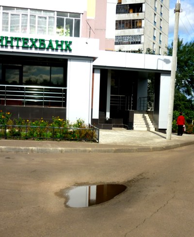 Не самая большая лужа возле дома 25/07Б имеет глубину не менее полметра, из-за чего там вполне может застрять автомобиль, или, еще того хуже, свалиться какой-нибудь велосипедист. К тому же дорога в этом месте основательно просела. Жители микрорайона уже не раз обращали внимание жилконторы на эти безобразия, но воз и ныне там.