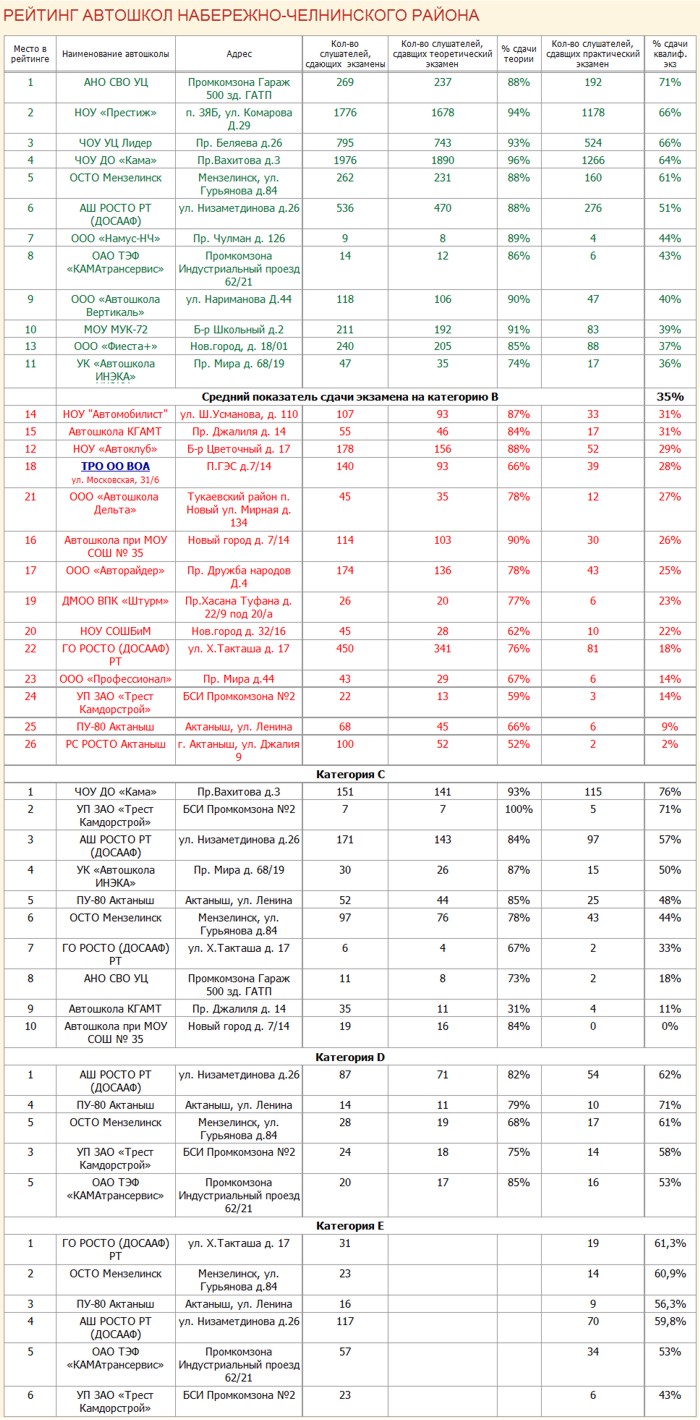 Федерация автошкол Республики Татарстан опубликовала рейтинг автошкол Набережно-челнинского региона. Он составлен по данным сдачи квалификационных экзаменов со 2 января 2011 года по 30 ноября 2011 года.