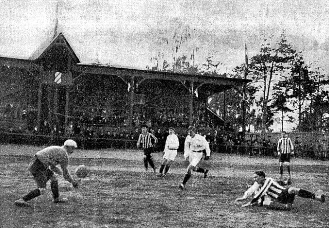 * В 1893 году в Петербурге на Семёновском плацу ипподрома (ныне Пионерская площадь) между командами «Спорт» и Василеостровским футбольным обществом состоялась одна из первых в России игр в «ножной мяч» — футбол. Эту игру к нам завезли (кто ж еще?) работавшие в России англичане. Они и составляли основу василеостровской команды. На плац кадетского корпуса гордые бритты вышли в форме голубого цвета. Имелась ли единая форма у наших – неизвестно. На воротах еще не висела сетка, не засчитывался гол с углового. Игрокам полагались защитные щитки – «ножной мяч» считался жесткой игрой, дозволялись любые силовые приемы. Футбол вызвал в прессе массу эмоций: «Площадь для игры была покрыта сплошь грязью, господа спортсмены в белых костюмах то и дело шлепались в нее и вскоре превратились в трубочистов. В публике стоял нескончаемый смех».