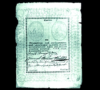 * В 1768 году из старых дворцовых салфеток и скатертей были выпущены первые русские бумажные деньги. Год спустя императрица Екатерина II издала манифест об основании двух ассигнационных банков и выпуске ассигнаций, т.е. бумажных денег. К этому ее вынудил рост военных расходов. Сначала ассигнаций будет выпущено умеренное количество, их размен на звонкую монету будет совершаться беспрепятственно, и потому они будут пользоваться любовью населения, которое оценит их удобство в сравнении с тяжелой медью. Первоначальный успех приведет к тому, что правительство станет выпускать бумажные деньги во все больших объемах для покрытия экстренных военных трат. В конце царствования Екатерины уже будет обращаться 150 миллионов ассигнаций, а разменного металлического фонда для них почти не будет. В результате за ассигнационный рубль станут давать не более 68 копеек, а цена всех товаров поднимется. Денежное обращение придет в беспорядок и дурно отразится на всем хозяйственном обиходе страны.