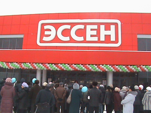 Cегодня в Набережных Челнах открывается новый гипермаркет «Эссен», расположенный по адресу Набережная Тукая, дом 2. Он будет первым в поселке ГЭС. Собравшихся на открытие горожан, развлекали танцами, песнями и различными конкурсами. В толпу бросали шоколадки и конфеты, дарили воздушные шарики. Люди охотно фотографируются с аниматорами, которые изображают персонажей фильма «Алиса в стране чудес». Само открытие, запланированное на 11 часов, задерживается — ждут высокопоставленных гостей.