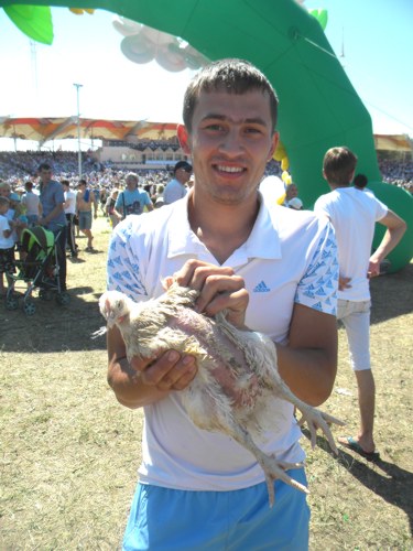 Айнур - футболист из Елабуги, профессиональый сброщик призов на Сабантуях. Он уже достал со столба курицу и выиграл барбекюшницу в "метании пней"