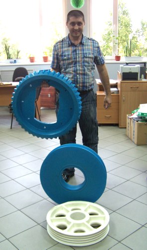 Например, крановый блок - колесо с выемкой для троса. Оно весит в несколько раз меньше металлического (из-за чего грузоподъемность крана повышается), а главное, трос меньше изнашивается. «Крановщики говорят, что им легче поменять блок, чем трос. Вот теперь они могут именно это и делать», - говорит Андрей.