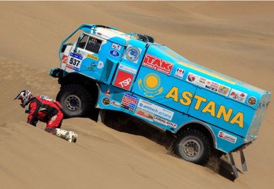 Но "КАМАЗ" все же попал на подиум - казахстанский экипаж во главе с Артуром Ардавичусом занял третье место. За него россияне болели, как за своего. Поскольку он ехал на грузовике, подготовленном командой «КАМАЗ-мастер» и пользовался на ралли ее технической поддержкой. Более того, по договоренности с камазовцами он проводил испытание двигателя «Камминз» в свете грядущих изменений регламента гонки в категории грузовиков.