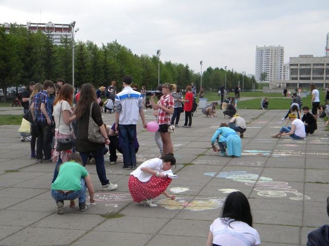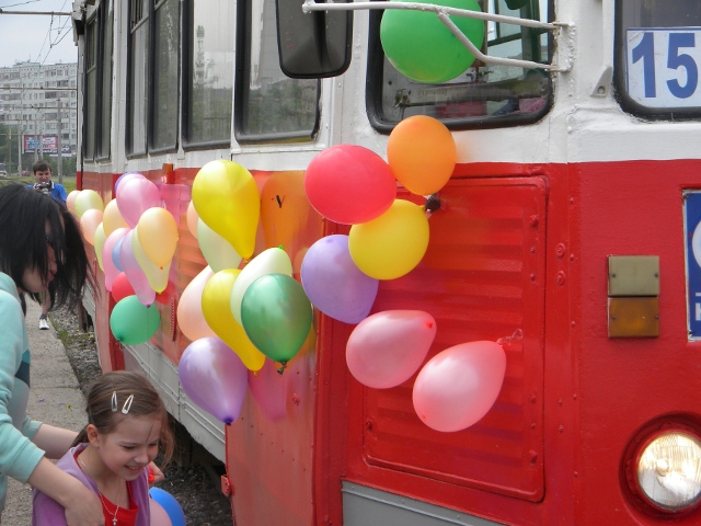 Сначала на "Пушкинской" украшают воздушными шарами проходящие мимо трамваи. А оттуда, как закончатся шарики, двигаются к площали "Азатлык", чтобы рисовать мелками на плитах парадной площадки Челнов.