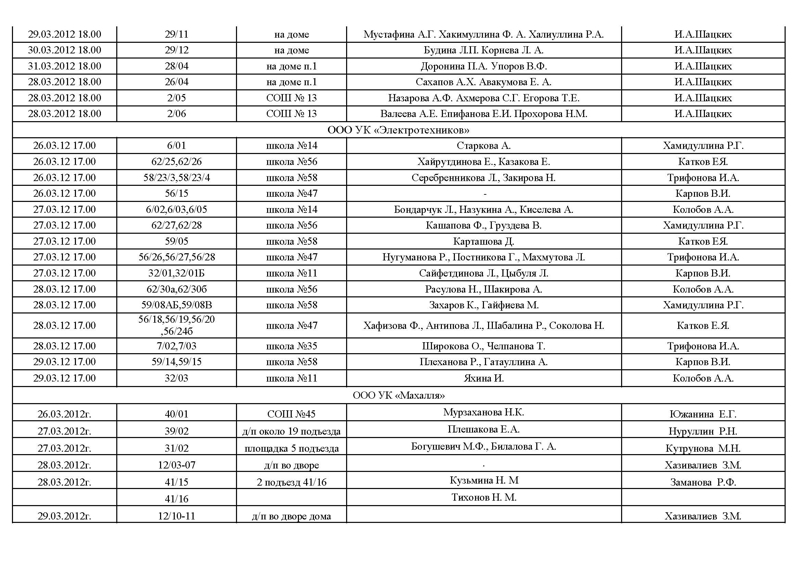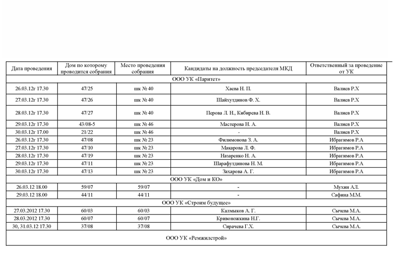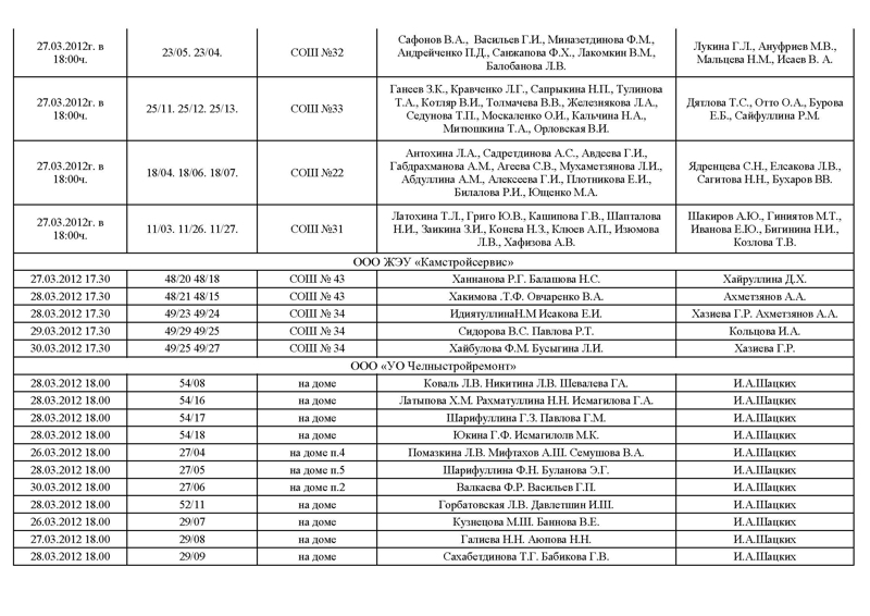 Публикуем утвержденный заместителем руководителя исполнительного комитета А.З. Зайнуллиным график проведения общих собраний по выбору председателей многоквартирных домов (МКД) в период с 26.03.2012 по 01.04.2012 года.
