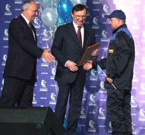 Владимир Путин 15 февраля пробыл на «КАМАЗе» не дольше 7 минут. Обычно он приезжал по-спортивному в ветровке. Если смотрел машины, садился за руль. А тут поднялся на импровизированную сцену (ее соорудили из двух бортовых «КАМАЗов») в строгом черном костюме, белой рубашке и черном галстуке в белый горошек. Народ встретил его овациями. «Проблем у вас было предостаточно, начиная с 90-х годов, - сказал премьер. - И последнее испытание кризисом тоже было очень серьезным. И все-таки мы вместе с вами все эти трудности преодолели. Сегодня «КАМАЗ» вышел не только на докризисный уровень производства, но и на новый уровень качества, является лидером в России и странах СНГ в своем секторе. Я уже не говорю о «Дакаре», где вы первые в мире на протяжении многих лет. Я вас искренне и от всей души поздравляю. «КАМАЗ» – предмет особой нашей гордости. И двухмиллионная машина – это результат вашей работы». Затем Владимир Путин спустился со сцены к грузовику-юбиляру, расписался на его двери и быстро удалился. (Ему еще предстояло провести совещание в БСМП).