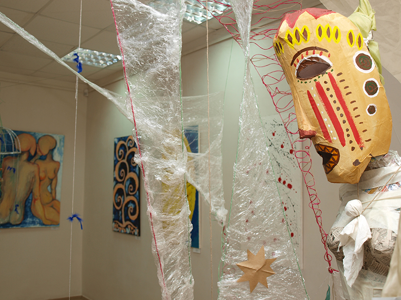 рядились, устраивали сражения. Арт-пространство выставки не предполагает никаких боев. На стенах — картины и панно. В углах — костюмы, этническая керамика, арт-объект от молодых художников «Нардуган». Он сделан из из скотча, ниток, шнура, бумаги. С потолка спускаются нити, на которых закреплены ангелочки с пожеланиями и синие перышки.