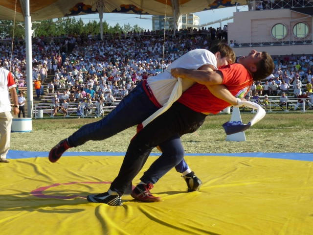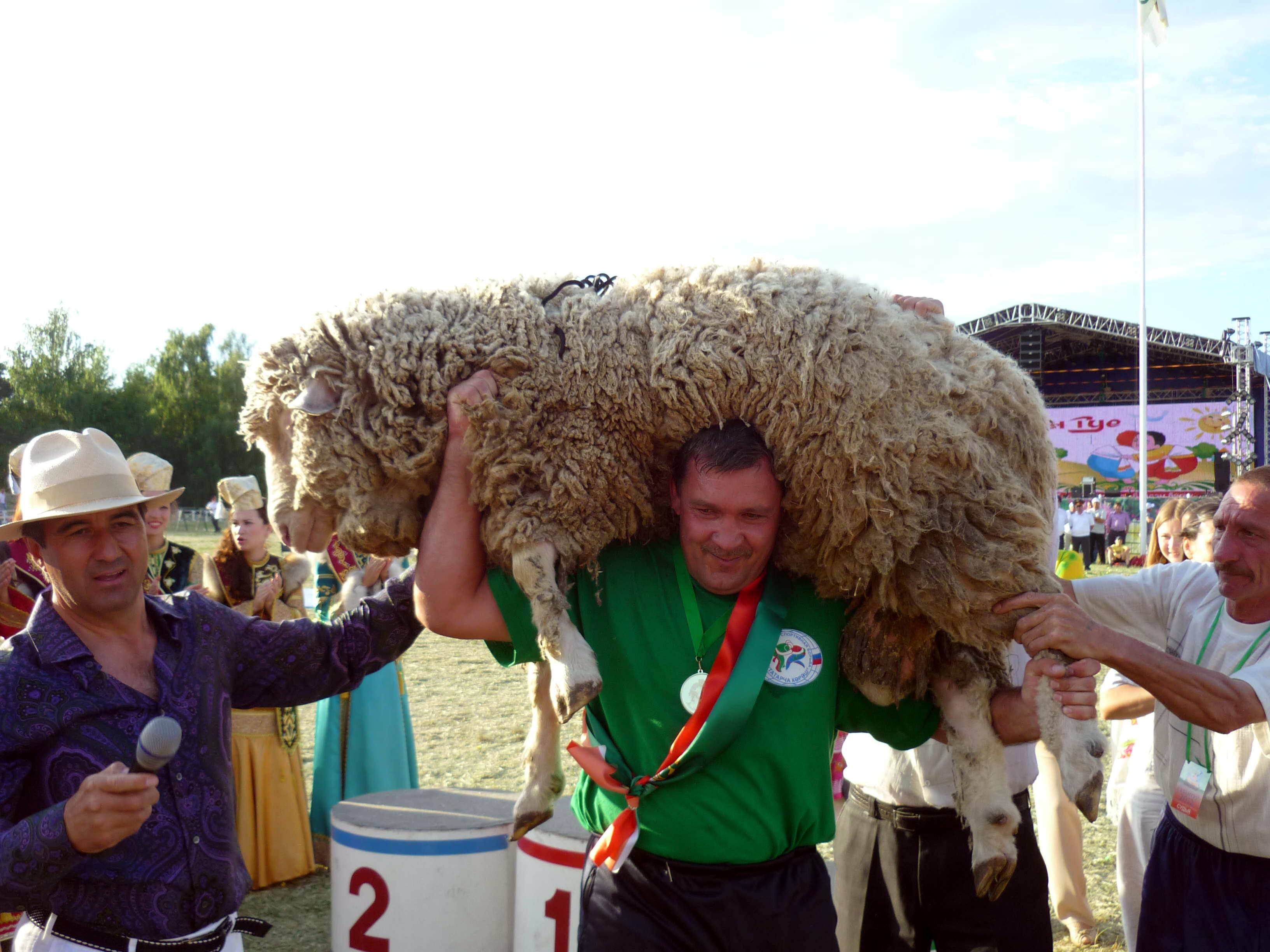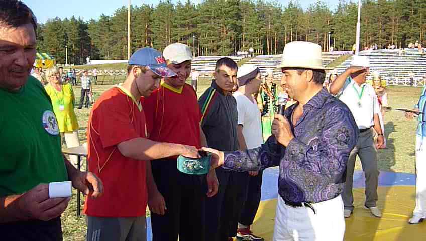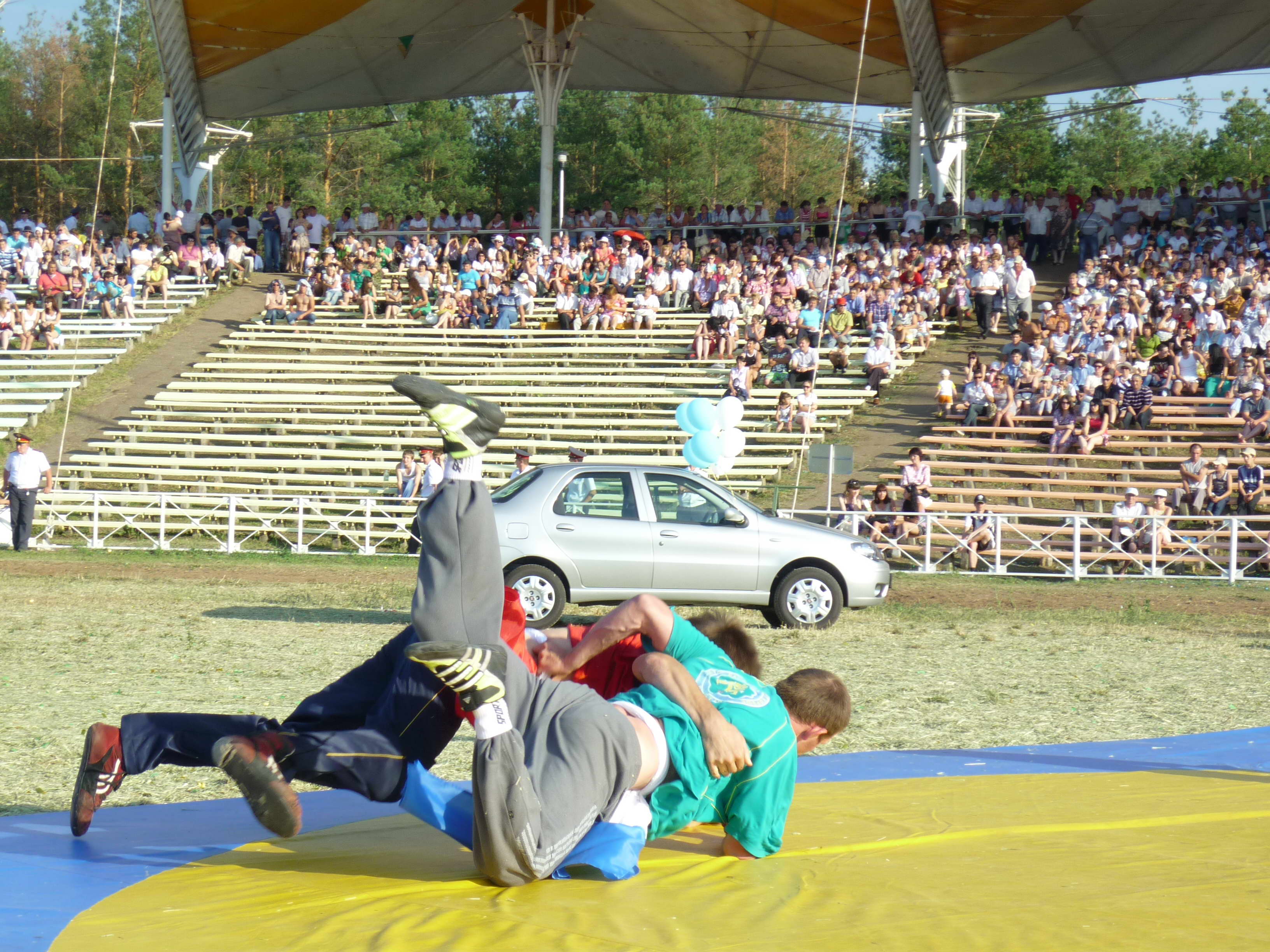 По официальным данным, в этом году на трех площадках, где проходили празднования Сабантуя, около 6,5 тысячи челнинцев приняли участие в различных играх, конкурсах и соревнованиях. В том числе и в национальной борьбе куреш. А кульминация спортивной части состоялась вечером на центральном Майдане в парке "Прибрежный", где собрались лучшие борцы, чтобы выявить абсолютного батыра Сабантуя. И еще одна интрига притягивала как участников, так и зрителей. В этом году решили разделить главный приз на две части. Барана - абсолюному победителю, а автомобиль мог выиграть победитель любой весовой категории посредством жребия. Таким образом уравнивались шансы тяжеловесов и "мухачей". Вот уж действительно, каждая схватка была ценой в автомобиль.