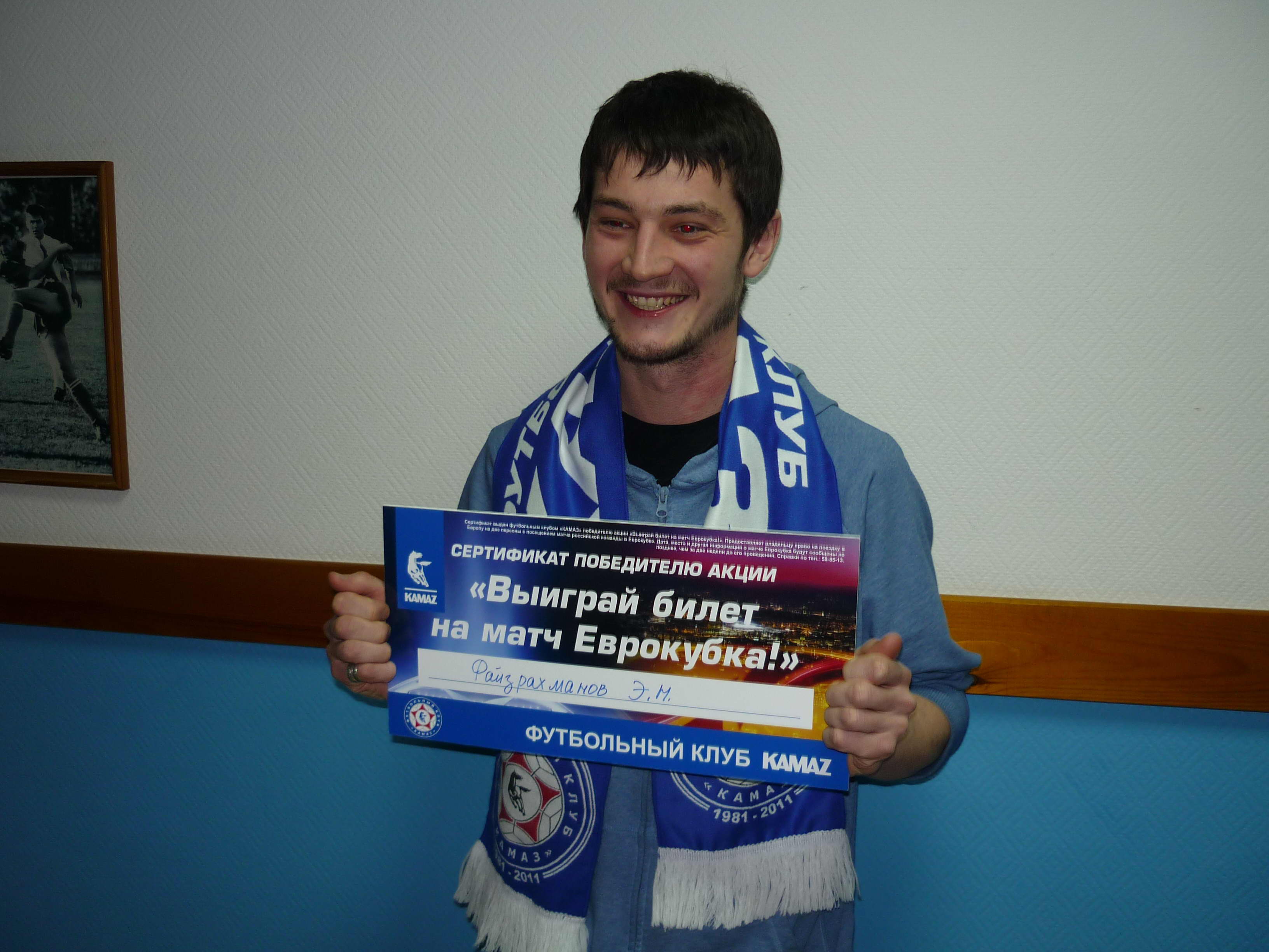 7 января футбольный клуб "КАМАЗ" провел среди своих болельщиков розыгрыш путевки на матч Лиги Европы с участием российской команды, который состоится в столице Греции Афины. По условиям этой акции, которая проводилась при поддержке рекламной службы ОАО "КАМАЗ", соискатели призов должны были посетить все домашние матчи челнинской команды во втором круге первенства и сдать билеты организаторам. На промежуточных этапах среди болельщиков было разыграно около десяти поездок на игры европейских кубков, которые проводились в нашей стране. А в финальную часть, на розыгрыш зарубежной поездки, были допущены четыре человека, четко выполнившие все условия этой спортивной лотереи. Розыгрыш состоялся в конференц-зале футбольного клуба. В нем приняли участие руководство "ФК "КАМАЗ", главный тренер команды и футболисты. Честь вручить сертификат на поездку победителю была предоставлена одному из ведущих челнинских футболистов Игорю Коронову. Путевка в Афины на два лица и билеты на европейский футбол достались 24-летнему повару Эдуарду Файзрахманову. Теперь его ждут приятные хлопоты по оформлению документов, ведь вылет в Афины, где он проведет три полновесных дня, уже 22 февраля. Всем остальным участникам розыгрыша были вручены призы и подарки от клуба и его генерального спонсора.