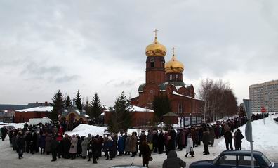 Огромные очереди отстаивают челнинские верующие, чтобы попасть в Боровецкую церковь для поклонения святыням. Чудотворные иконы: святой блаженной старицы Матроны Московской с частицей мощей и частицей гроба и мироточивый образ святителя Спиридона Тримифунтского с частицей сапожка, привезенный с острова Корфу и освященный на мощах святителя, прибыли в Набережные Челны 15 марта, и с тех пор очереди не уменьшаются. До этого святыни побывали в Москве, Тольятти, Сызрани, Саранске, Болгаре. «Перед иконами ежедневно читались акафисты и имели место исцеления и чудотворения», - говорят священники. Служителями церкви у входа организован чай, чтобы люди могли согреться. «Стоять-то долго. -говорит диакон Дмитрий Половников. - Днем не менее трех-четырех часов, очередь уменьшается только к вечеру». В выходные время ожидания затянулось до пяти часов. Святыни пробудут до 21 марта включительно, церковь открыта с 7 до 19 часов.