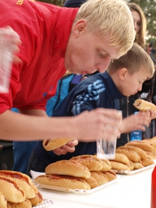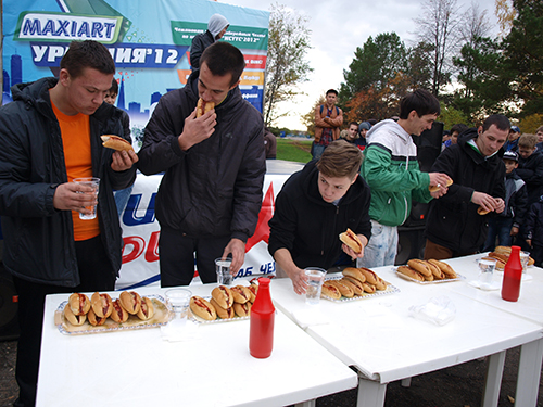 В Набережных Челнах впервые прошел чемпионат по поеданию хот-догов «Hot Rot». 12 участников, 130 хот-догов и пять минут на то, чтобы оставить как можно меньше еды на своем подносе – таковы были условия чемпионата. Эта дисциплина стала один из самых смешных эпизодов фестиваля уличных культур, который состоялся сегодня в парке Гренада. Не все участники дошли до финала – несколько человек в процессе буквально отваливались от стола с сосисками и мотали головой: больше не могу. Рекорд чемпионата – четыре с половиной хот-дога за пять минут. Любимцем зрителей стал самый младший участник, живописно уничтожавший булочки с сосисками поначалу наравне со взрослыми, но быстро сошедший с дистанции. Победители получили сертификаты на фотосессию, хотя главная фотосессия в их жизни, похоже, уже случилась.