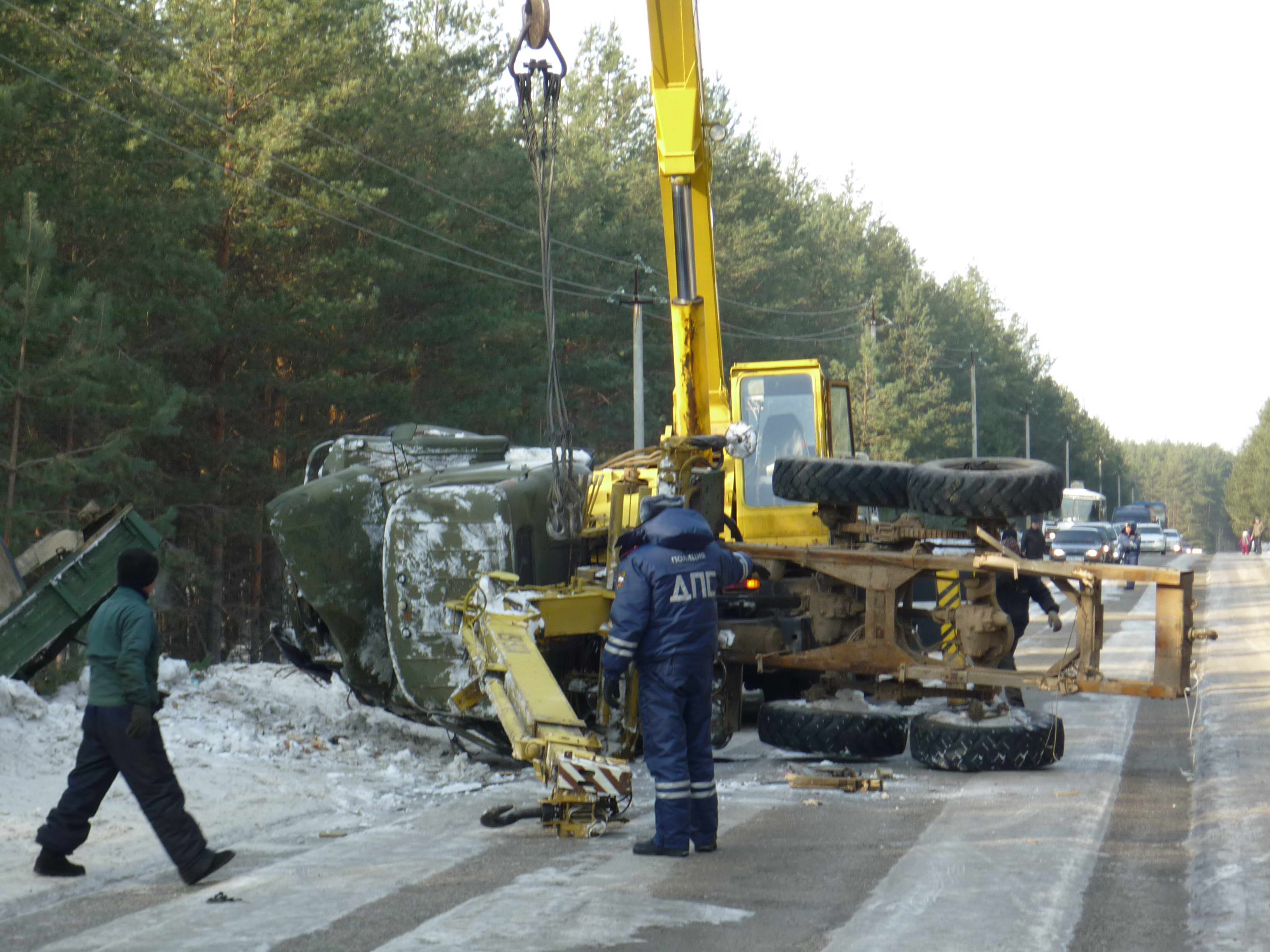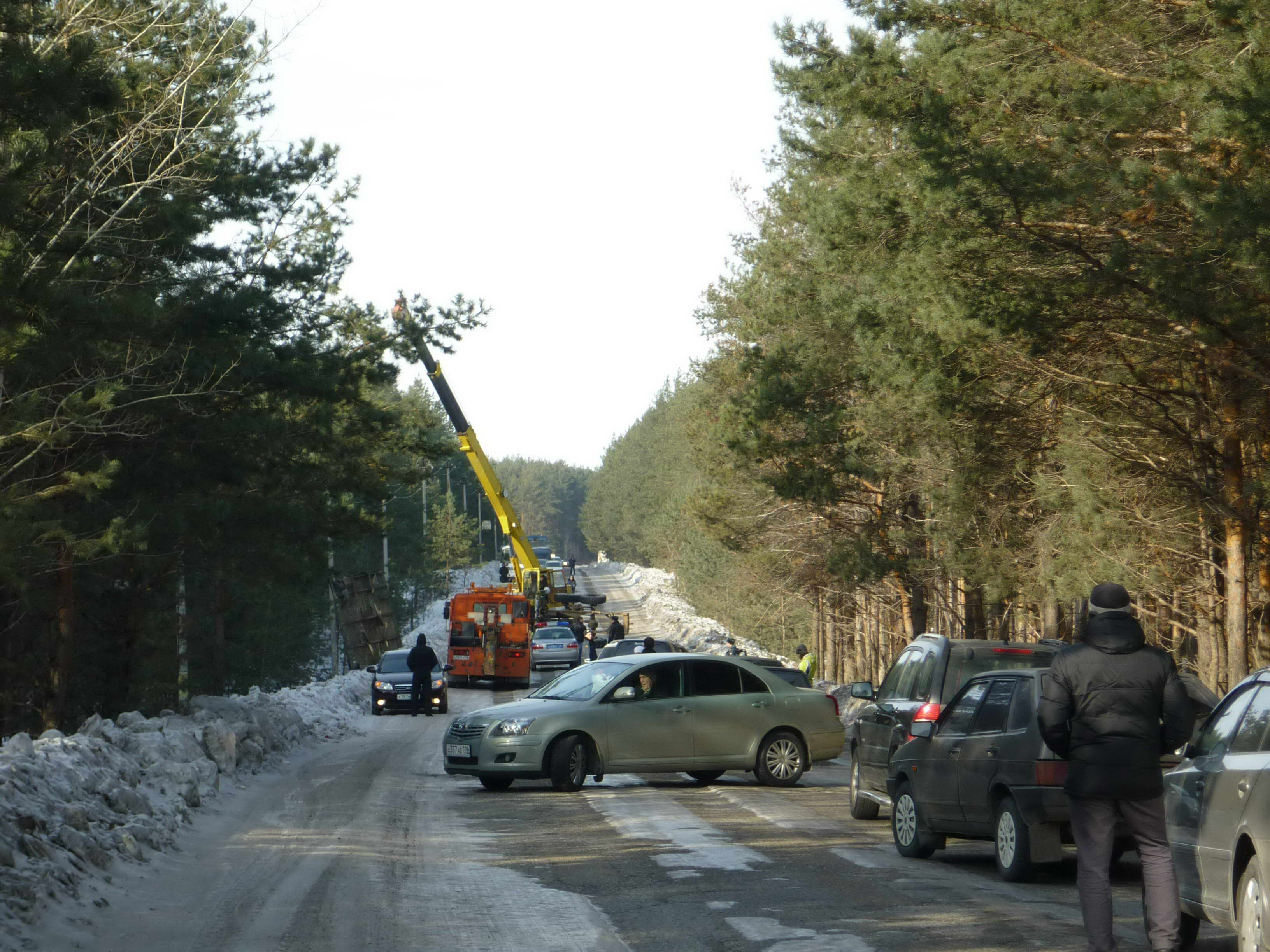 Около 12 часов дня 25 февраля на дороге на базы отдыха образовалась большая пробка. Понятно было, что произошла авария. Вскоре выяснилось, что ДТП случилось накануне ночью. Ехавший со стороны баз отдыха грузовой автомобиль "ЗИЛ" с подъемником вылетел в кювет и лег на бок. Водитель с места ДТП скрылся. Когда был обнаружен опрокинувшийся грузовик, сотрудники ГИБДД вызвали автокран, чтобы достать брошенную машину, и на время работ примерно на полчаса перекрыли движение.