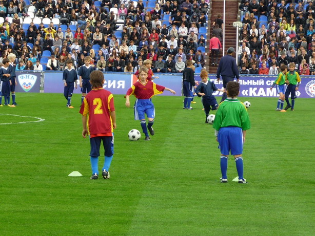 На поле высыпали около сотни ребятишек, занимающихся в футбольных секциях Центра подготовки футболистов ФК "КАМАЗ" и ДЮСШ "Строитель". Они сдали импровизированный экзамен, продемонстрировав свое умение в обращении с мячом. Произнесли торжественную клятву. После этого игроки основного состава "КАМАЗа" и ветераны вручили им по комплекту футбольной формы.