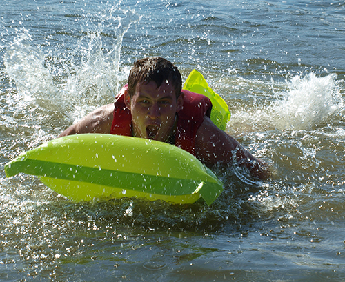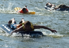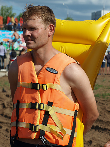 В Набережных Челнах впервые прошли гонки на надувных матрасах. Заплыв в акватории пляжа стал самым веселым соревнованием, проведенным в рамках Дня молодежи. Записались участвовать 18 человек, на старт явились 13. И всего одна девушка! Худенькая, маленькая, всего 45 килограммов. «Плаваете хорошо?» - спросили мы Айгуль Давлетзянову, юриста частной фирмы. Она улыбнулась: «Не очень». Однако участвовать в гонках не передумала. Ей достался поощрительный приз – сертификат на две тысячи рублей в спортивный магазин.