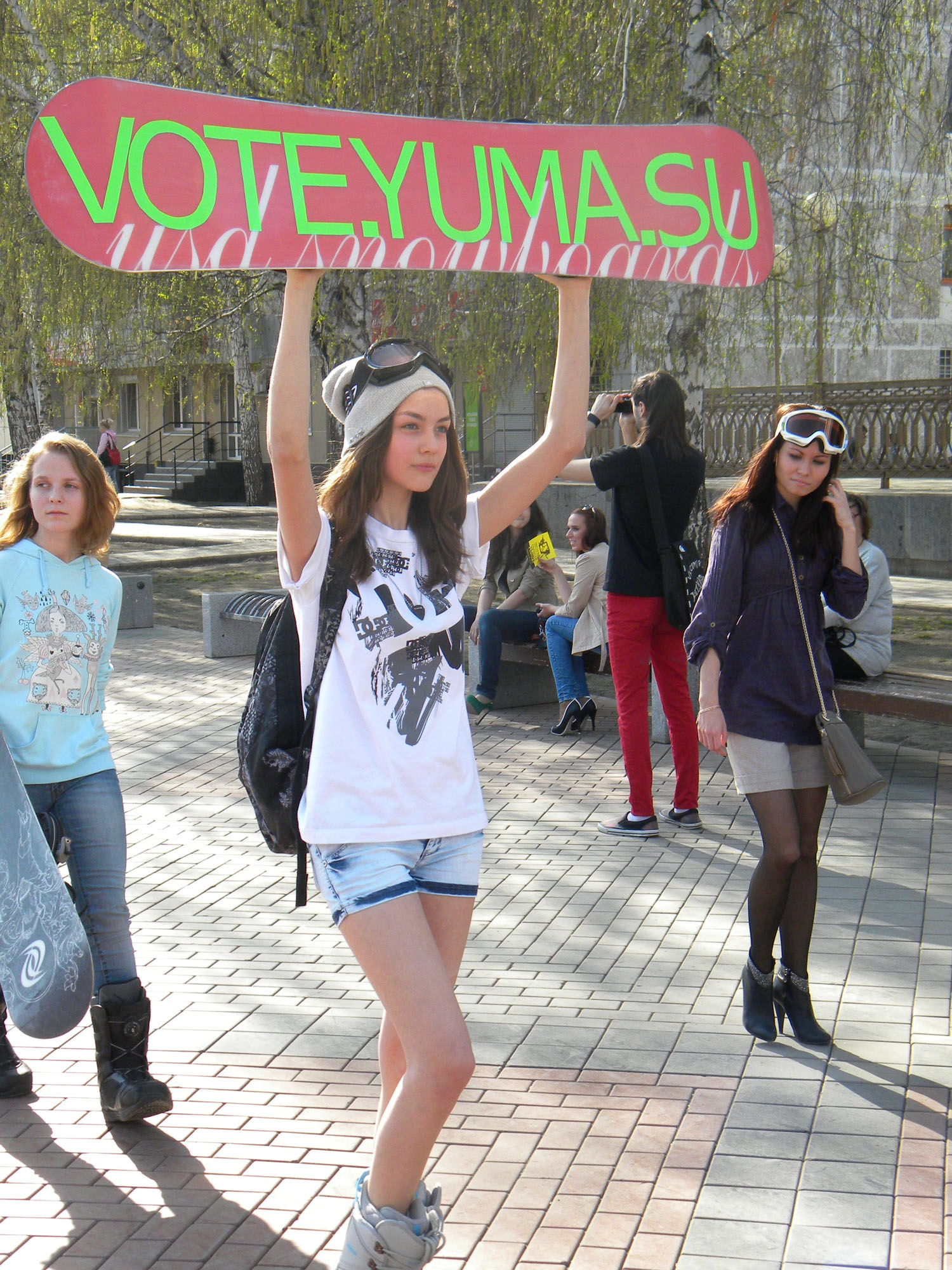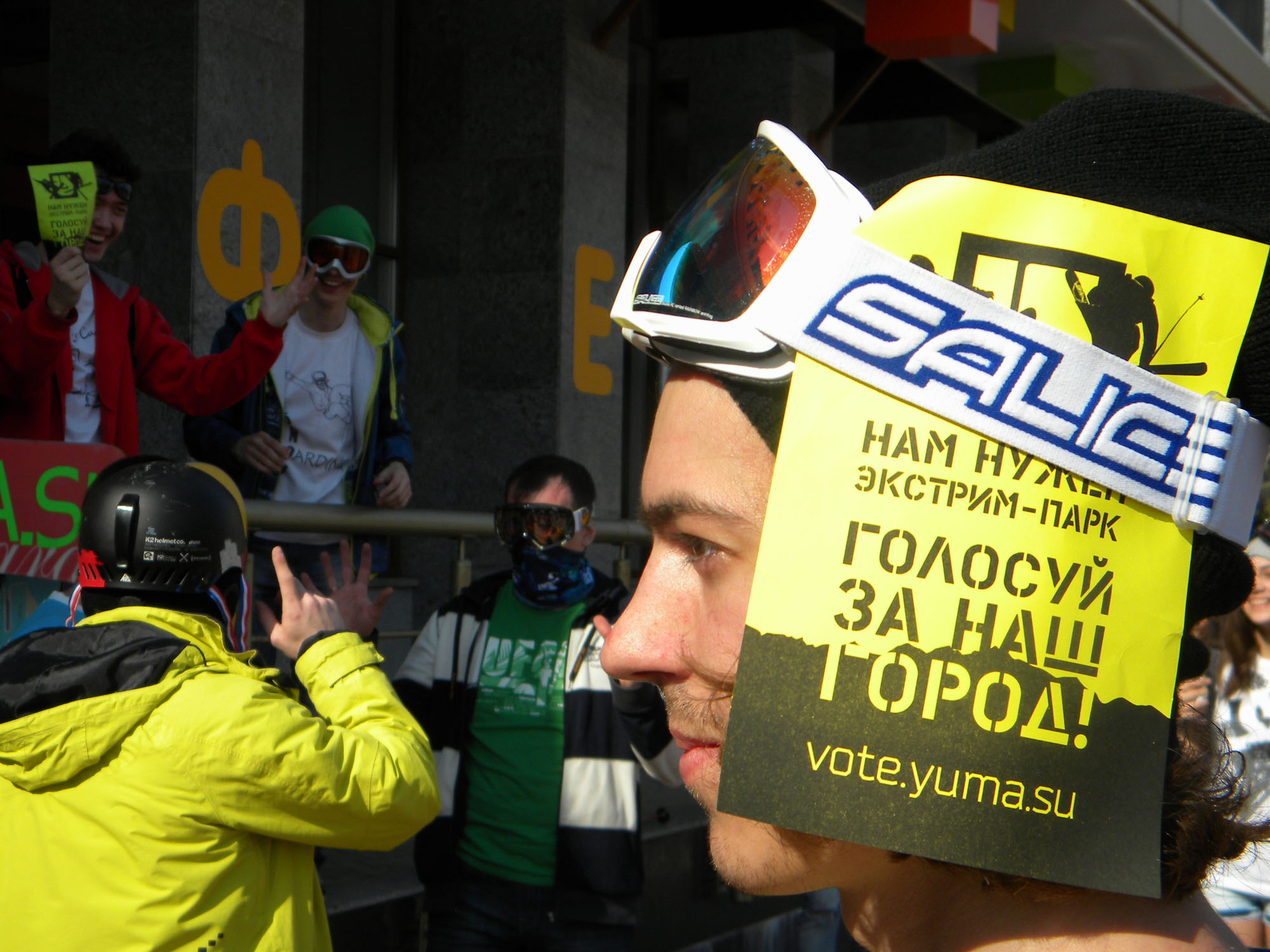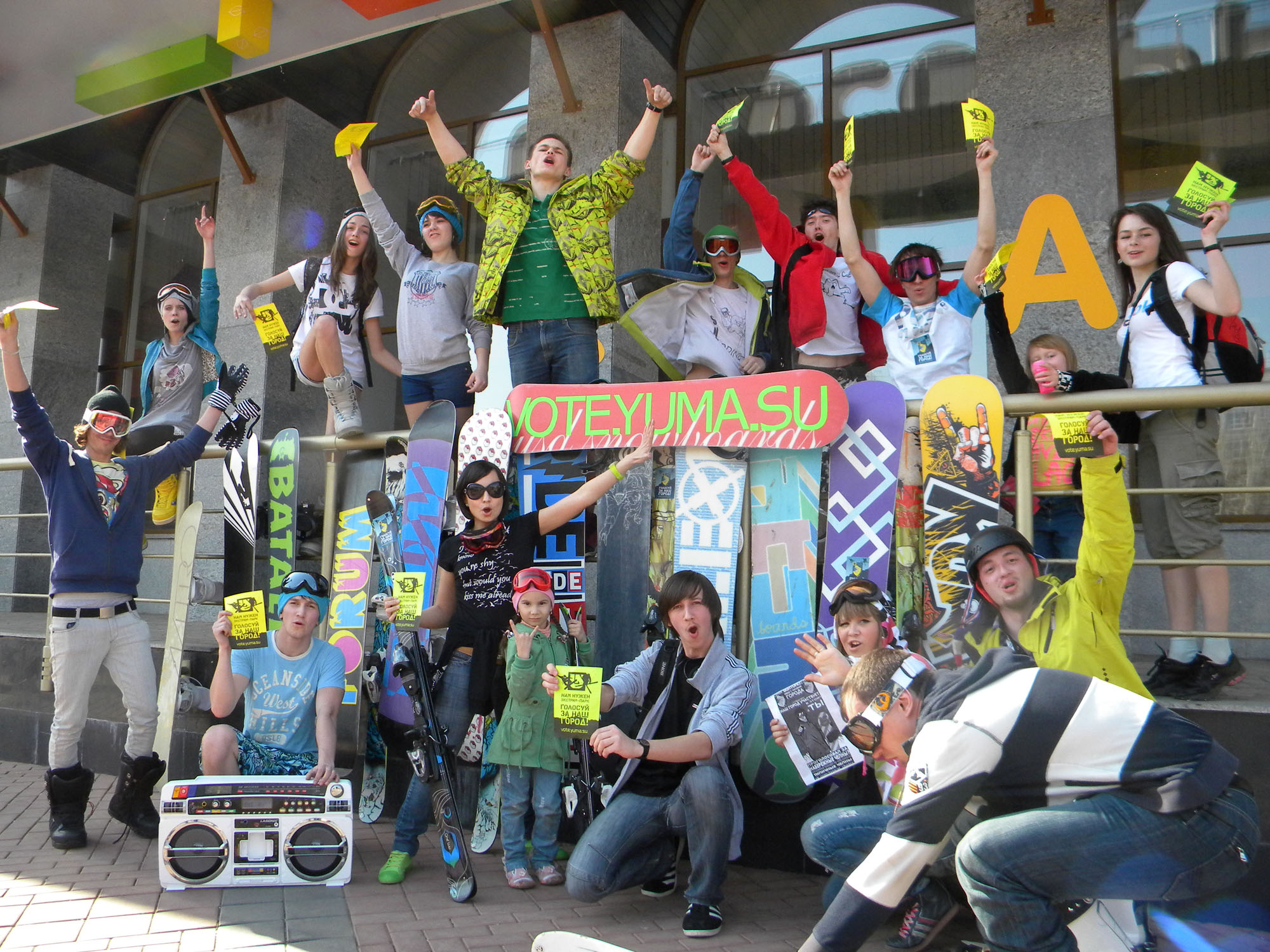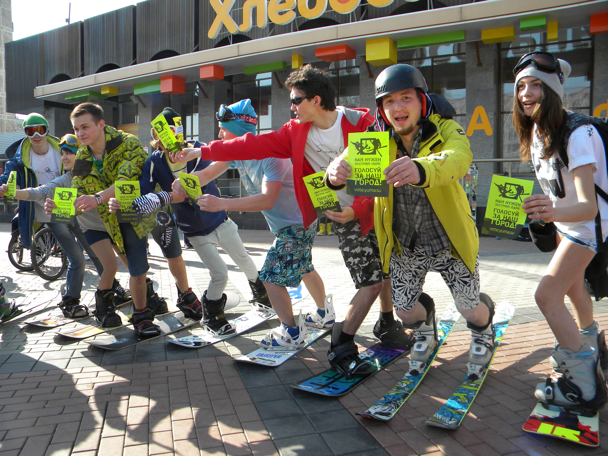 В Набережных Челнах только что прошел флеш-моб в поддержку строительства сноуборд-парка в нашем городе. Актив флеш-моба строил стены из зимнего спортивного инвентаря, смело передвигался по асфальту на сноубордах и раздавал листовки прохожим с просьбой проголосовать за наш город.