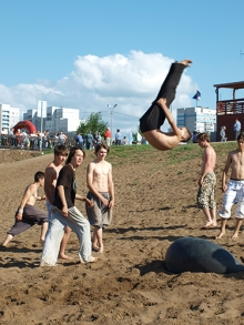 Как и полагается молодежному празднику, где во главу угла поставлен спорт и патриотическое воспитание, он объявлен безалкогольным. Поэтому у входа к пляжу возникает небольшая заминка – часть пришедших на праздник вливает в себя пиво, чтобы пройти мимо полицейского заграждения без бутылок.