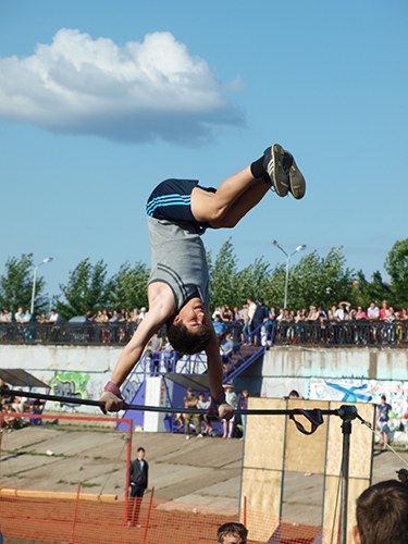 Сегодня на набережной город отмечает День молодежи. Главных героев праздника – молодежь – не просто развлекают. Устраивая праздничное шоу, зрителем предлагают положительный пример: быстрее, выше, сильнее. Модные молодые люди показывают класс в экстремальных видах спорта: на скейтах, велосипедах BMX. Трейсеры делают сальто в воздухе. Мускулистые ребята на турнике делают «свечу», к этим показательным выступлениям присоединяется мэр города. Под одобрительный гул Василь Шайхразиев делает подъем с переворотом. Тем временем у военно-спортивных команд продолжаются соревнования на «Тропе мужества»: готовые к армии парни из разных учебных заведений проходят полосу препятствий. Народ на набережной со стороны смотрит на соревнования, комментирует выступление аквабайкеров на открытой воде.